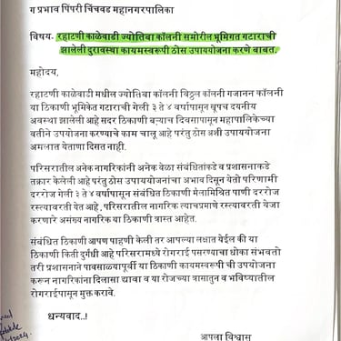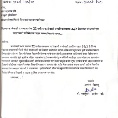 नागरिकांच्या आरोग्यासाठी सुलभ व सुरक्षित ड्रेनेज लाईन व्यवस्था उभारली आहे. जुन्या लाईन दुरुस्ती, नवीन पाइप टाकणे व सांडपाणी योग्य मार्गाने वाहून जाण्यासाठी दर्जेदार काम पूर्ण केले आहे. काळेवाडीतील पुणेरी स्वीट व नाथकृपा डेअरी परिसरात अनेक दिवसांपासून गटाराचे पाणी रस्त्यावर वाहत असल्याने दुर्गंधी व आरोग्याचा प्रश्न निर्माण झाला होता. प्रशासनाला तातडीने कायमस्वरूपी उपाययोजना करण्याच्या सूचनांनंतर ऑगस्ट–सप्टेंबरमध्ये दर्जेदार काम पूर्ण झाले. यामुळे परिसरातील नागरिक व व्यावसायिकांना दिलासा मिळाला.
