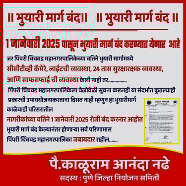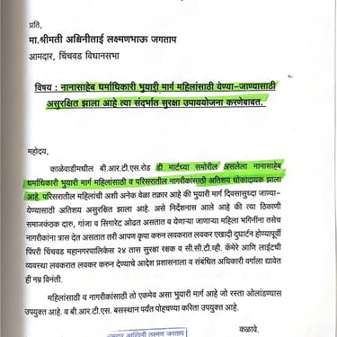 काळेवाडीच्या डीमार्टच्या समोर असणारा हा नाना धर्माधिकारी भुयारी मार्ग काळेवाडीच्या वाहतुकीच्या व नागरिकांच्या दृष्टिकोनातून अत्यंत महत्त्वाचा असणाऱ्या अशा भुयारी मार्गाची अवस्था सुलभ शौचालया सारखी 2022-23 या वर्षांमध्ये झाली होती. त्यासाठी अत्यंत आंदोलनात्मक परिस्थिती निर्माण करून प्रशासनाकडून त्याच्या सुरक्षा रक्षकाचे, स्वच्छतेचे व सीसीटीव्ही व सुशोभीकरणाचे काम करून घेतले.